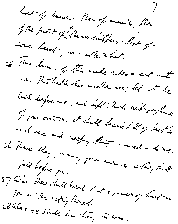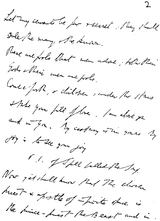 me, ye people of sighing! 18. These are dead, these fellows; they feel not. We are not for the poor and sad: the lords of the earth are our kinsfolk. 19. Is a God to live in a dog? No! but the highest are of us. They shall rejoice, our chosen: who sorroweth is not of us. 20. Beauty and strength, leaping laughter and delicious languor, force and fire, are of us. 21. We have nothing with the outcast and the unfit: let them die in their misery. For they feel not. Compassion is the vice of kings: stamp down the wretched & the weak: this is the law of the strong: this is our law and the joy of the world. Think not, o king, upon that lie: That Thou Must Die: verily thou shalt not die, but live. Now let it be understood: If the body of the King dissolve, he shall remain in pure ecstasy for ever. Nuit! Hadit! Ra-Hoor-Khuit! The Sun, Strength & Sight, Light; these are for the servants of the Star & the Snake. 22. I am the Snake that giveth Knowledge & Delight and bright glory, and stir the hearts of men with drunkenness. To worship me take wine and strange drugs whereof I will tell my prophet, & be drunk thereof! They shall not harm ye at all. It is a lie, this folly against self. The exposure of innocence is a lie. Be strong, o man! lust, enjoy all things of sense and rapture: fear not that any God shall deny thee for this. 23. I am alone: there is no God where I am. 24. Behold! these be grave mysteries; for there are also of my friends who be hermits. Now think not to find them in the forest or on the mountain; but in beds of purple, caressed by magnificent beasts of women with large limbs, and fire and light in their eyes, and masses of flaming hair about them; there shall ye find them. Ye shall see them at rule, at victorious armies, at all the joy; and there shall be in them a joy a million times greater than this. Beware lest any force another, King against King! Love one another with burning hearts; on the low men trample in the fierce lust of your pride, in the day of your wrath. 25. Ye are against the people, O my chosen! 26. I am the secret Serpent coiled about to spring: in my coiling there is joy. If I lift up my head, I and my Nuit are one. If I droop down mine head, and shoot forth venom, then is rapture of the earth, and I and the earth are one. 27. There is great danger in me; for who doth not understand these runes shall make a great miss. He shall fall down into the pit called Because, and there he shall perish with the dogs of Reason. 28. Now a curse upon Because and his kin! 29. May Because be accursed for ever! 30. If Will stops and cries Why, invoking Because, then Will stops & does nought. 31. If Power asks why, then is Power weakness. 32. Also reason is a lie; for there is a factor infinite & unknown; & all their words are skew-wise. 33. Enough of Because! Be he damned for a dog! 34. But ye, o my people, rise up & awake! 35. Let the rituals be rightly performed with joy & beauty! 36. There are rituals of the elements and feasts of the times. 37. A feast for the first night of the Prophet and his Bride! 38. A feasy for the three days of the writingof the Book of the Law. 39. A feast for Tahuti and the child of the Prophet--secret, O Prophet! 40. A feast for the Supreme Ritual, and a feast for the Equinox of the Gods. 41. A feast for fire and a feast for water; a feast for life and a greater feast for death! 42. A feast every day in your hearts in the joy of my rapture! 43. A feast every night unto Nu, and the pleasure of uttermost delight! 44. Aye! feast! rejoice! there is no dread hereafter. There is the dissolution, and eternal ecstasy in the kisses of Nu. 45. There is death for the dogs. 46. Dost thou fail? Art thou sorry? Is fear in thine heart? 47. Where I am these are not. 48. Pity not the fallen! I never knew them. I am not for them. I console not: I hate the consoled & the consoler. 49. I am unique & conqueror. I am not of the slaves that perish. Be they damned & dead! Amen. (This is of the 4: there is a fifth who is invisible, & therein am I as a babe in an egg. ) 50. Blue am I and gold in the light of my bride: but the red gleam is in my eyes; & my spangles are purple & green. 51. Purple beyond purple: it is the light higher than eyesight. 52. There is a veil: that veil is black. It is the veil of the modest woman; it is the veil of sorrow, & the pall of death: this is none of me. Tear down that lying spectre of the centuries: veil not your vices in virtuous words: these vices are my service; ye do well, & I will reward you here and hereafter. 53. Fear not, o prophet, when these words are said, thou shalt not be sorry. Thou art emphatically my chosen; and blessed are the eyes that thou shalt look upon with gladness. But I will hide thee in a mask of sorrow: they that see thee shall fear thou art fallen: but I lift thee up. 54. Nor shall they who cry aloud their folly that thou meanest nought avail; thou shall reveal it: thou availest: they are the slaves of because: They are not of me. The stops as thou wilt; the letters? change them not in style or value! 55. Thou shalt obtain the order & value of the English Alphabet; thou shalt find new symbols to attribute them unto. 56. Begone! ye mockers; even though ye laugh in my honour ye shall laugh not long: then when ye are sad know that I have forsaken you. 57. He that is righteous shall be righteous still; he that is filthy shall be filthy still. 58. Yea! deem not of change: ye shall be as ye are, & not other. Therefore the kings of the earth shall be Kings for ever: the slaves shall serve. There is none that shall be cast down or lifted up: all is ever as it was. Yet there are masked ones my servants: it may be that yonder beggar is a King. A King may choose his garment as he will: there is no certain test: but a beggar cannot hide his poverty. 59. Beware therefore! Love all, lest perchance is a King concealed! Say you so? Fool! If he be a King, thou canst not hurt him. 60. Therefore strike hard & low, and to hell w