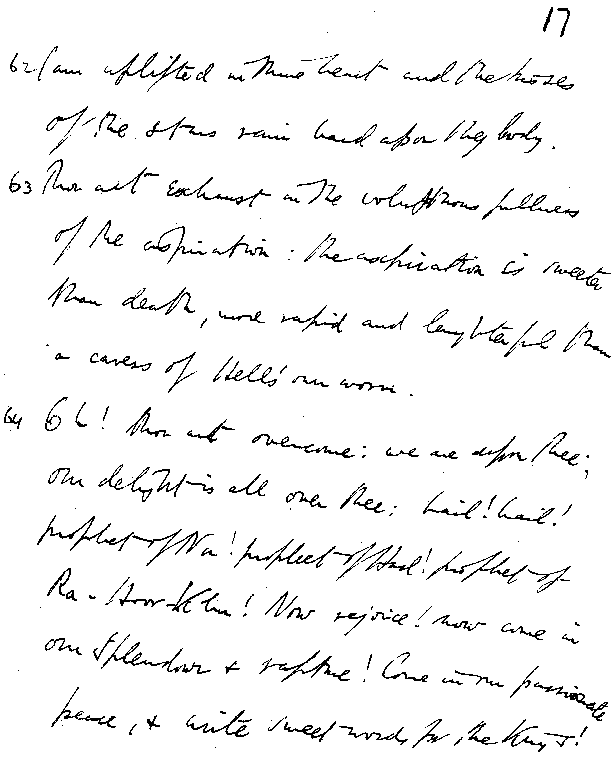 The Book of the LawLiber AL vel Legissub figura CCXXas delivered by XCIII = 418 to DCLXVIChapter I Chapter I Chapter III The Stele of Revealing Chapter I1. Had! The manifestation of Nuit. 2. The unveiling of the company of heaven. 3. Every man and every woman is a star. 4. Every number is infinite; there is no difference. 5. Help me, o warrior lord of Thebes, in my unveiling before the Children of men! 6. Be thou Hadit, my secret centre, my heart & my tongue! 7. Behold! it is revealed by Aiwass the minister of Hoor-paar-kraat. 8. The Khabs is in the Khu, not the Khu in the Khabs. 9. Worship then the Khabs, and behold my light shed over you! 10. Let my servants be few & secret: they shall rule the many & the known. 11. These are fools that men adore; both their Gods & their men are fools. 12. Come forth, o children, under the stars, & take your fill of love! 13. I am above you and in you. My ecstasy is in yours. My joy is to see your joy. 14. Above, the gemmed azure is 15. Now ye shall know that the chosen priest & apostle of infinite space is the prince-priest the Beast; and in his woman called the Scarlet Woman is all power given. They shall gather my children into their fold: they shall bring the glory of the stars into the hearts of men. 16. For he is ever a sun, and she a moon. But to him is the winged secret flame, and to her the stooping starlight. 17. But ye are not so chosen. 18. Burn upon their brows, o splendrous serpent! 19. O azure-lidded woman, bend upon them! 20. The key of the rituals is in the secret word which I have given unto him. 21. With the God & the Adorer I am nothing: they do not see me. They are as upon the earth; I am Heaven, and there is no other God than me, and my lord Hadit. 22. Now, therefore, I am known to ye by my name Nuit, and to him by a secret name which I will give him when at last he knoweth me. Since I am Infinite Space, and the Infinite Stars thereof, do ye also thus. Bind nothing! Let there be no difference made among you between any one thing & any other thing; for thereby there cometh hurt. 23. But whoso availeth in this, let him be the chief of all! 24. I am Nuit, and my word is six and fifty. 25. Divide, add, multiply, and understand. 26. Then saith the prophet and slave of the beauteous one: Who am I, and what shall be the sign? So she answered him, bendingdown, a lambent flame of blue, all-touching, all penetrant, her lovely hands upon the black earth, & her lithe body arched for love, and her soft feet not hurting the little flowers: Thou knowest! And the sign shall be my ecstasy, the consciousness of the continuity of existence, the omnipresence of my body. 27. Then the priest answered & said unto the Queen of Space, kissing her lovely brows, and the dew of her light bathing his whole body in a sweet-smelling perfume of sweat: O Nuit, continuous one of Heaven, let it be ever thus; that men speak not of Thee as One but as None; and let them speak not of thee at all, since thou art continuous! 28. None, breathed the light, faint & faery, of the stars, and two. 29. For I am divided for love's sake, for the chance of union. 30. This is the creation of the world, that the pain of division is as nothing, and the joy of dissolution all. 31. For these fools of men and their woes care not thou at all! They feel little; what is, is balanced by weak joys; but ye are my chosen ones. 32. Obey my prophet! follow out the ordeals of my knowledge! seek me only! Then the joys of my love will redeem ye from all pain. This is so: I swear it by the vault of my body; by my sacred heart and tongue; by all I can give, by all I desire of ye all. 33. Then the priest fell into a deep trance or swoon, & said unto the Queen of Heaven; Write unto us the ordeals; write unto us the rituals; write unto us the law! 34. But she said: the ordeals I write not: the rituals shall be half known and half concealed: the Law is for all. 35. This that thou writest is the threefold book of Law. 36. My scribe Ankh-af-na-khonsu, the priest of the princes, shall not in one letter change this book; but lest there be folly, he shall comment thereupon by the wisdom of Ra-Hoor-Khuit. 37. Also the mantras and spells; the obeah and the wanga; the work of the wand and the work of the sword; these he shall learn and teach. 38. He must teach; but he may make severe the ordeals. 39. The word of the Law is THELEMA. 40. Who calls us Thelemites will do no wrong, if he look but close into the word. For there are therein Three Grades, the Hermit, and the Lover, and the man of Earth. Do what thou wilt shall be the whole of the Law. 41. The word of Sin is Restriction. O man! refuse not thy wife, if she will! O lover, if thou wilt, depart! There is no bond that can unite the divided but love: all else is a curse. Accursed! Accursed be it to the aeons! Hell. 42. Let it be that state of manyhood bound and loathing. So with thy all; thou hast no right but to do thy will. 43. Do that, and no other shall say nay. 44. For pure will, unassuaged of purpose, delivered from the lust of result, is every way perfect. 45. The Perfect and the Perfect are one Perfect and not two; nay, are none! 46. Nothing is a secret key of this law. Sixty-one the Jews call it; I call it eight, eighty, four hundred & eighteen. 47. But they have the half: unite by thine art so that all disappear. 48. My prophet is a fool with his one, one, one; are not they the Ox, and none by the Book? 49. Abrogate are all rituals, all ordeals, all words and signs. Ra-Hoor-Khuit hath taken his seat in the East at the Equinox of the Gods; and let Asar be with Isa, who also are one. But they are not of me. Let Asar be the adorant, Isa the sufferer; Hoor in his secret name and splendour is the Lord initiating. 50. There is a word to say about the Hierophantic task. Behold! there are three ordeals in one, and it may be given in three ways. The gross must pass through fire; let the fine be tried in intellect, and the lofty chosen ones in the highest. Thu
